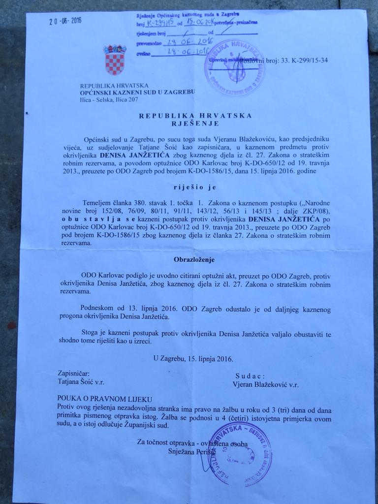 – Općinsko državno odvjetništvo je odustalo od kaznenog progona. Nisu pronašli niti jedan element kojim bi se mene teretilo stoga je proces okončan pravomoćnim rješenjem. Optužnica koja je bila postavljena bila je vrlo ”klimava”. Naime i samo Općinsko državno odvjetništvo u Karlovcu za mene je tražilo uvjetnu kaznu čime su sami pokazali da nema elemenata, ispričao je Janžetić.