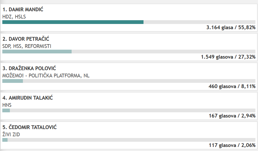 Prema broju obrađenih glasačkih listića HDZ-ov Damir Mandić za sad vodi s 55,82 % (3 164 glasova). Iza njega je Davor Petračić kojem je podršku pružila koalicija predvođena SDP-om s 1 549 glasova, odnosno 27,32 %. Na trećem mjestu je Draženka Polović sa 8,11 %, iza nje je Amirudin Talakić iz HNS-a s 2,94 %, dok je za sad najmanje glasova birača dobio Čedomir Tatalović iz Živog zida 2,06 %.