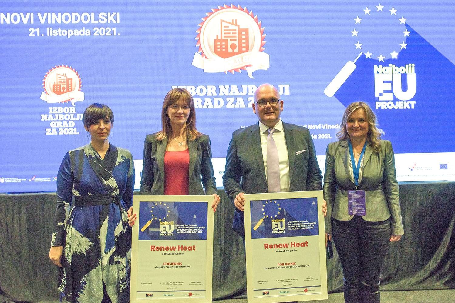 Renew Heat, projekt Karlovačke županija pobjednik je u kategoriji najbolji EU projekt s doprinosom poduzetništvu. Renew Heat proglašen je i za uvjerljivog pobjednika u ovome izboru i prema glasovima čitatelja Jutarnjeg lista. U glasovanju je sudjelovalo oko deset tisuća građana, a u konačnici dobio visokih 41 posto glasova.