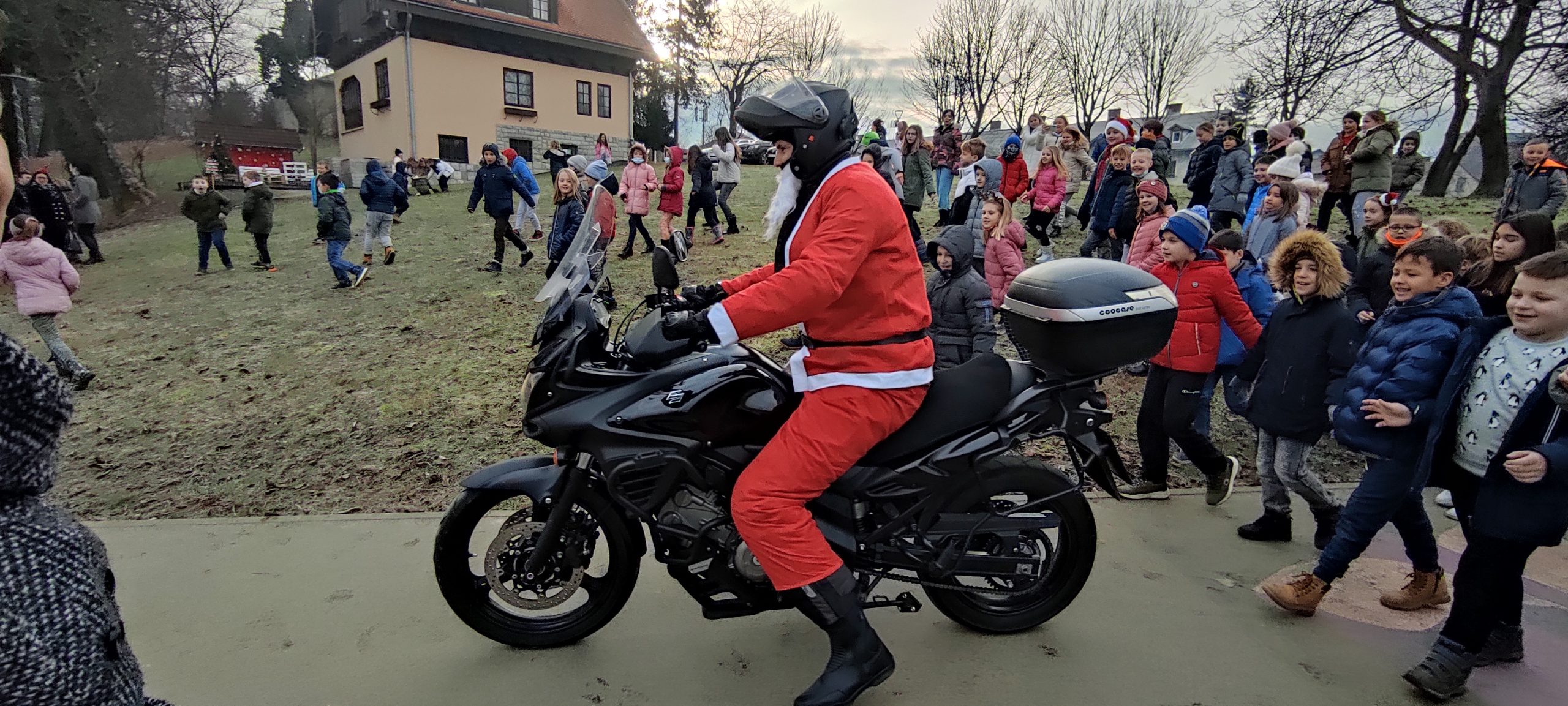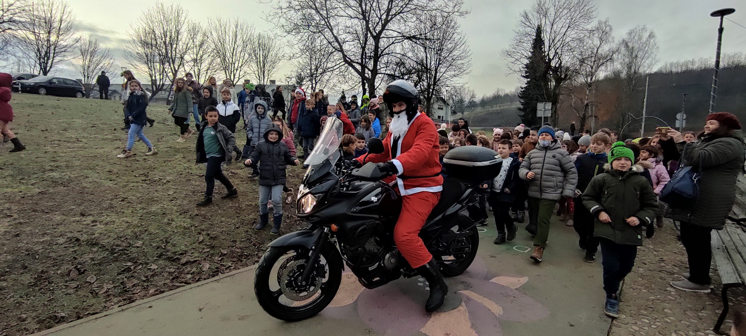 Osnovnoškolci iz Duge Rese radosno su dočekali djedice na motorima znajući da će dobiti vrećicu slatkiša.