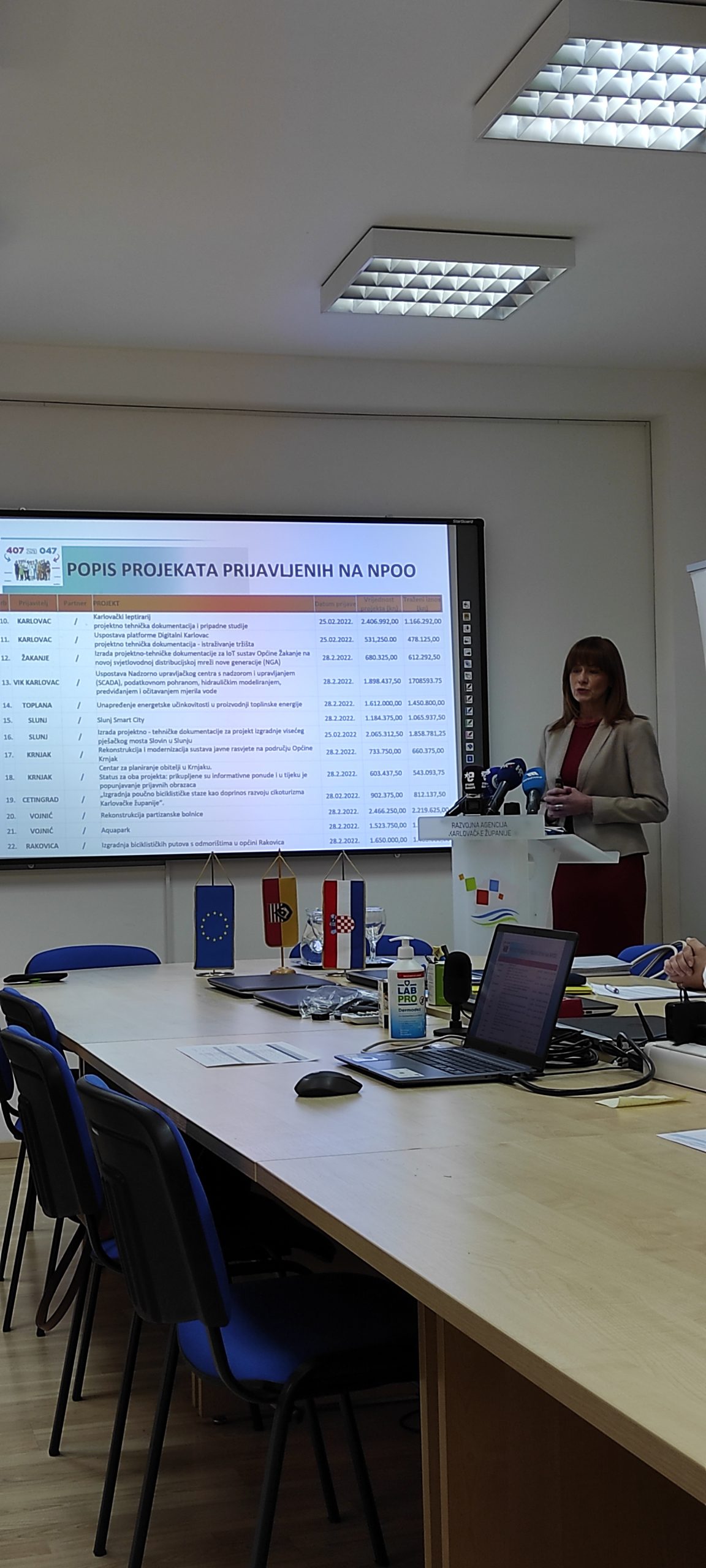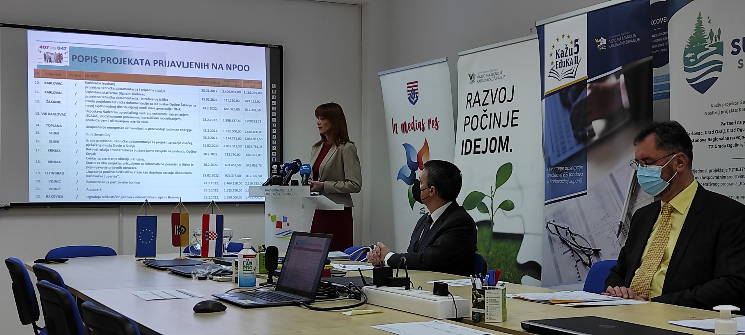 Prijavljeni projekti koji su predstavljeni su: Karlovac SKOK- skladišno -obučni kompleks Jamadol, Digitalna transformacija javnog prijevoza u Karlovačkoj županiji, Izgradnja i opremanje biciklističkih traka i ostale biciklističke infrastrukture (odmorišta) u duljini od 29,5 km obostrano u razini kolnika županijske ceste ŽC3256 od državne ceste DC23 do državne ceste DC1, Kampus zdravlja Švarča, Dorina kuća, Centar zdravlja Draganić, Dogradnja i rekonstrukcija MIOŠ-a, Energetska obnova Haulikove 14, Centar integrirane zdravstvene skrbi Karlovac.