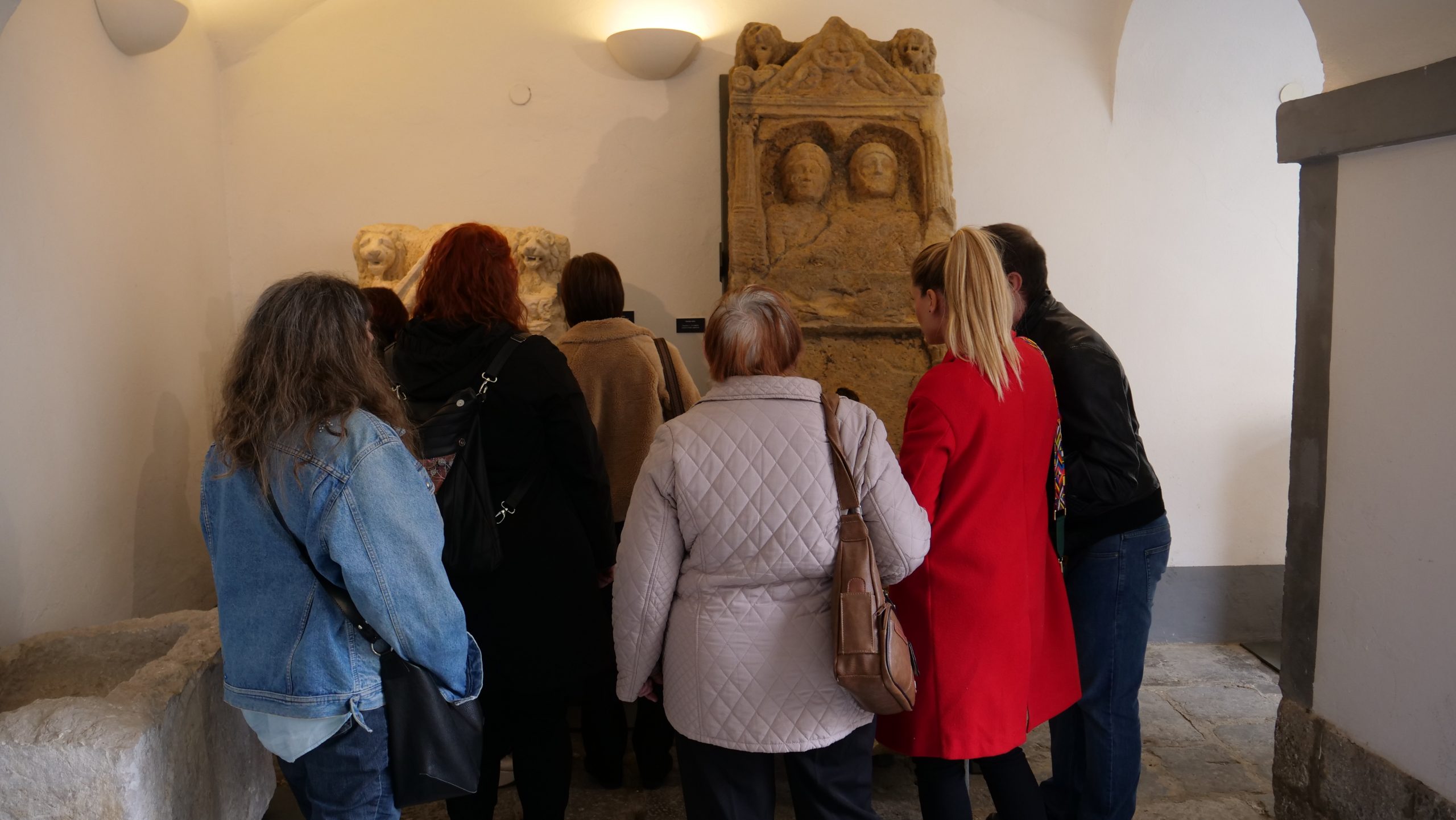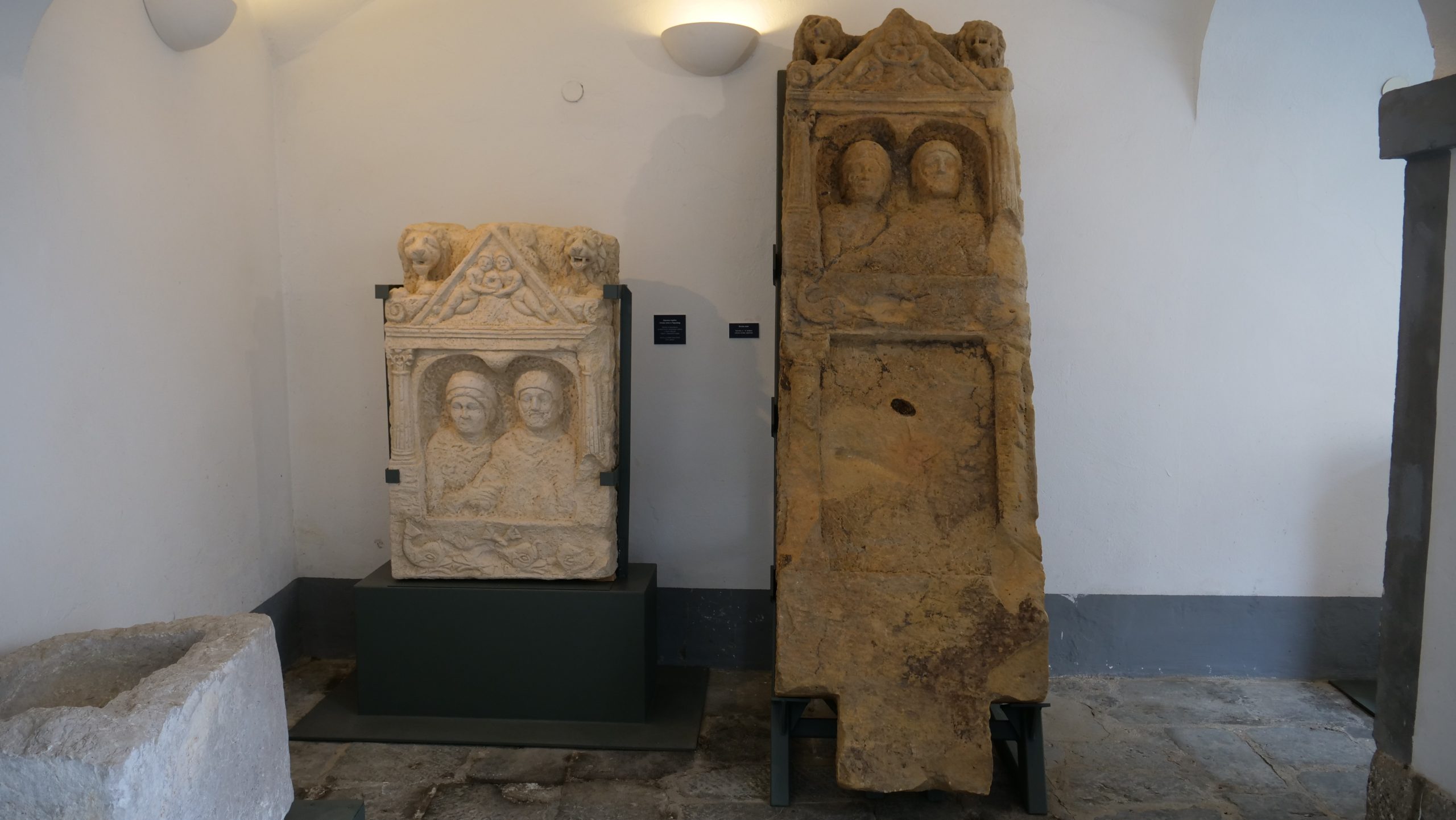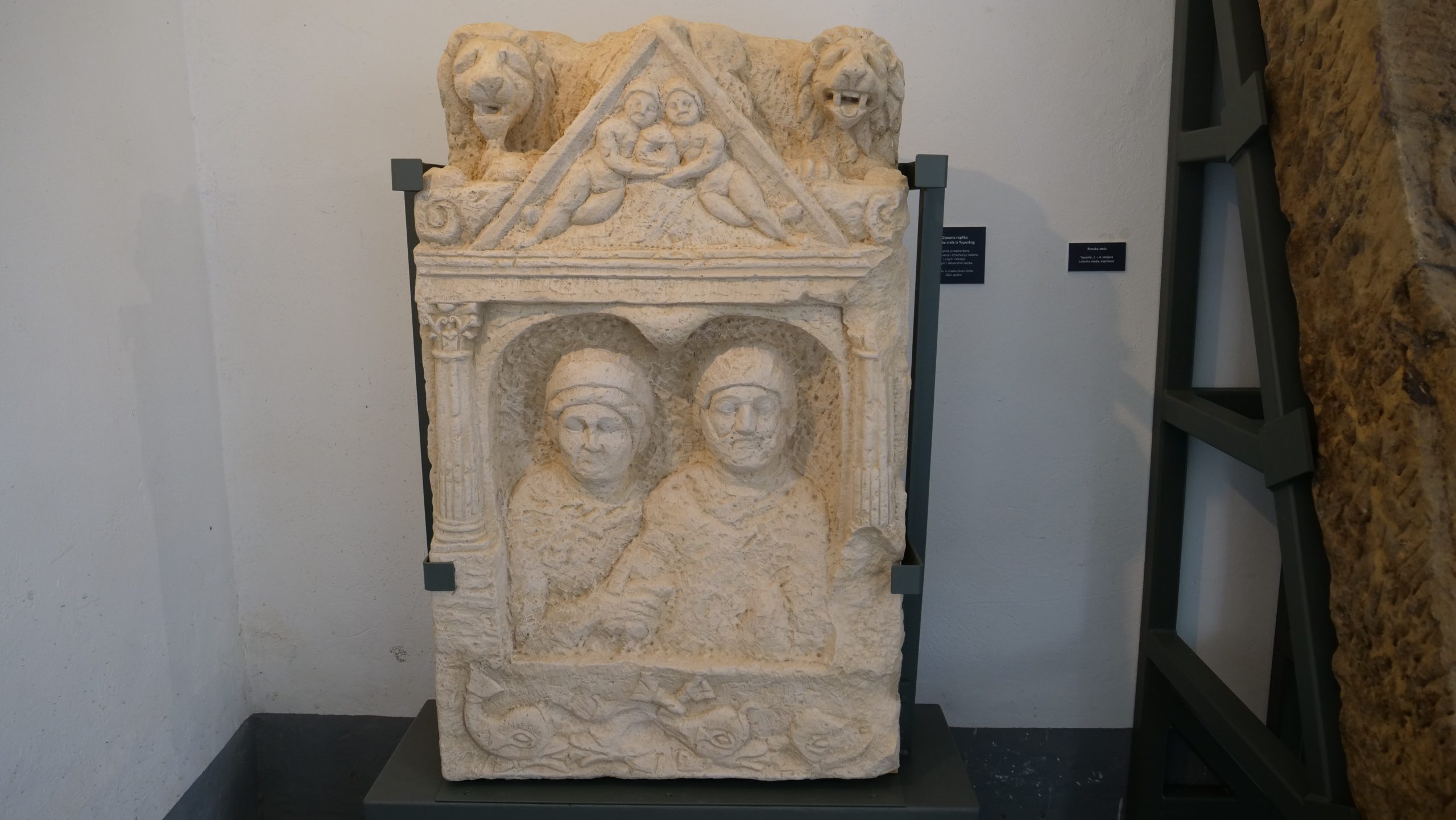 – radi se o velikoj steli koja je dopremljena iz Topuskog. Predstavlja spomenik nepoznatog bračnog para. Mi sa ovakvih spomenika često u arheologiji saznajemo njihova imena pa čak i godine koje su imali u trenutku smrti, kod ove to nažalost nije slučaj jer je donji dio utučen pa smo ostali zakinuti za taj dio natpisnog polja. Stelu tako možemo datirati u široki raspon od 1.- 4. stoljeća kako i stoji u arheološkoj dokumentaciji, no ja bih slobodno mogla reći da je to početak 2. stoljeća pa do 4. stoljeća jer se na području središnje Hrvatske ovakve monumentalne velike stele rijetko pojavljuju prije početka 2. stoljeća, no naravno, može biti i izuzetak, ispričala je autorica izložbe i kustosica arheološkog odjela Matea Galetić.