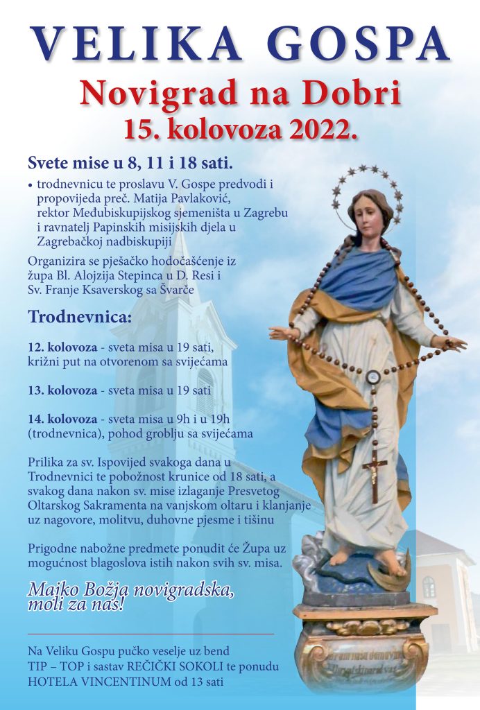 Župa Novigrad na Dobri u ponedjeljak, 15. kolovoza, slavi svetkovinu Uznesenja Blažene Djevice Marije na nebo – Veliku Gospu kao svoju najveću zaštitnicu koja kroz tisuću godina štiti, čuva, moli, zagovara ovo mjesto i njezine stanovnike. Priprema za proslavu započinje trodnevnicom.
