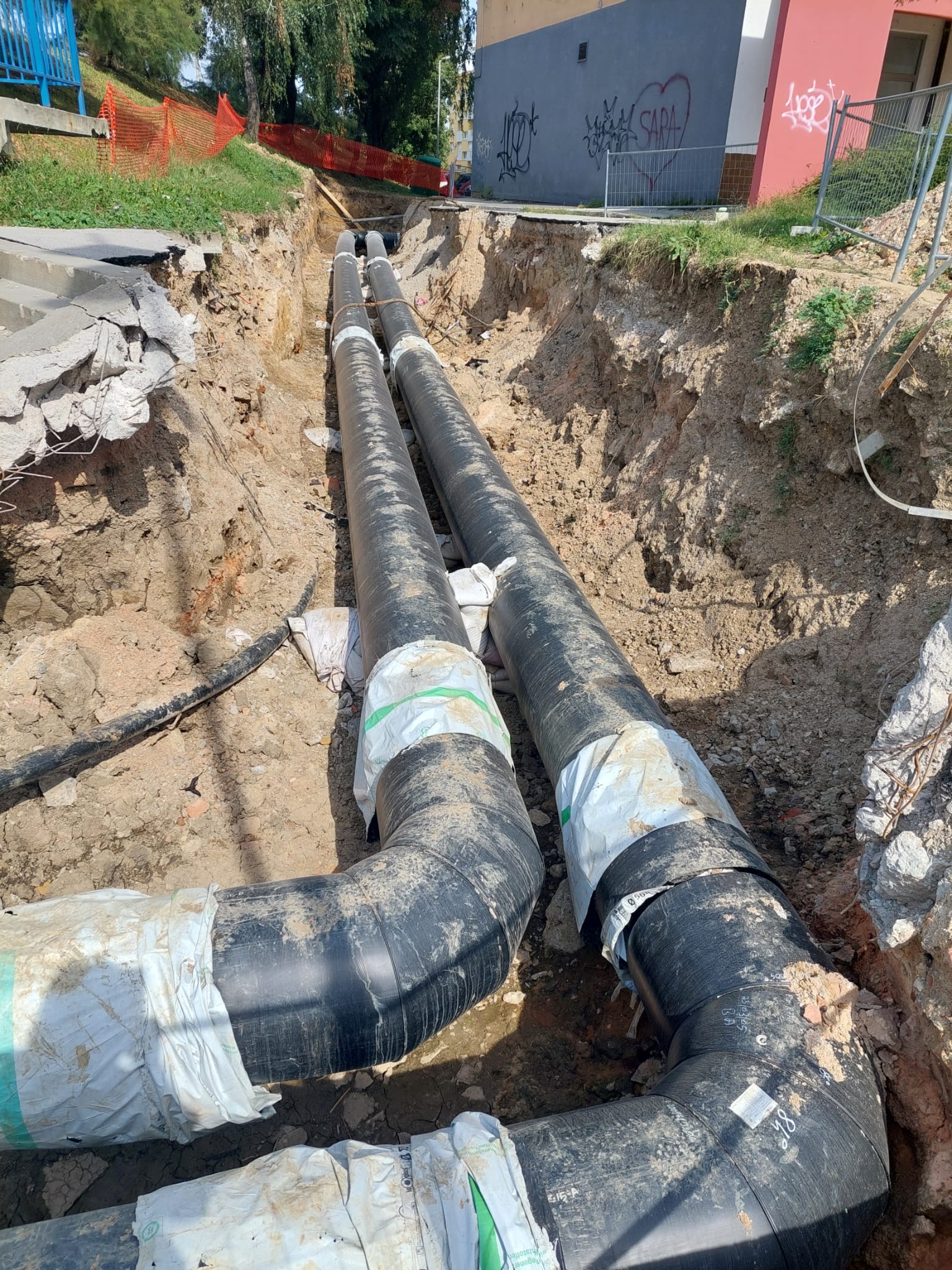 Kiše samo što nisu počele. Ugao zgrade je udaljen 50 cm od dubokog rova. Asfalt je (već) puknuo, puknuli su rubnjaci…  iskopani rovovi su puni smeća: cipela, papira, plastike, otpada od skinutih keramičkih pločica, i sve će to završiti na izolaciji cijevi…