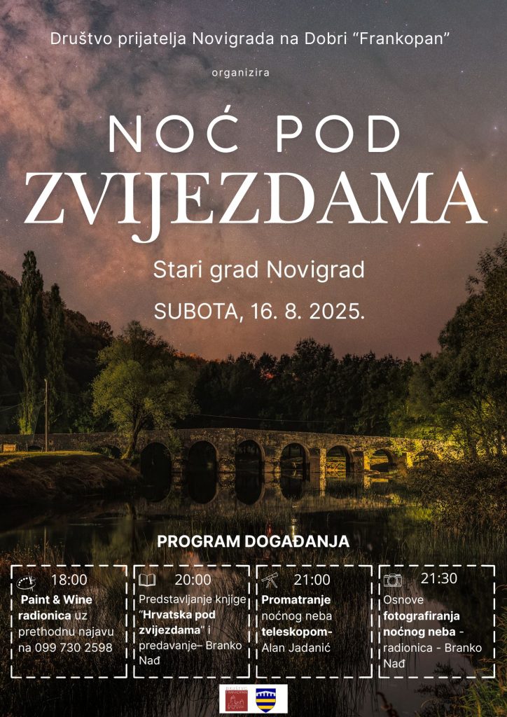 Društva prijatelja Novigrada na Dobri “Frankopan” organizira manifestaciju “Noć pod zvijezdama” koja će se održati u subotu, 16. kolovoza 2025. u jedinstvenom ambijentu Starog grada Novigrada na Dobri.