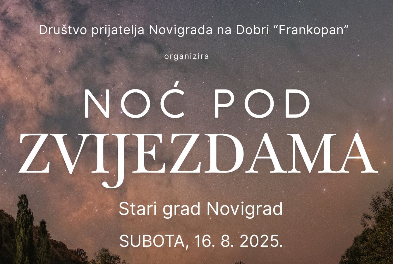 Društva prijatelja Novigrada na Dobri “Frankopan” organizira manifestaciju “Noć pod zvijezdama” koja će se održati u subotu, 16. kolovoza 2025. u jedinstvenom ambijentu Starog grada Novigrada na Dobri.