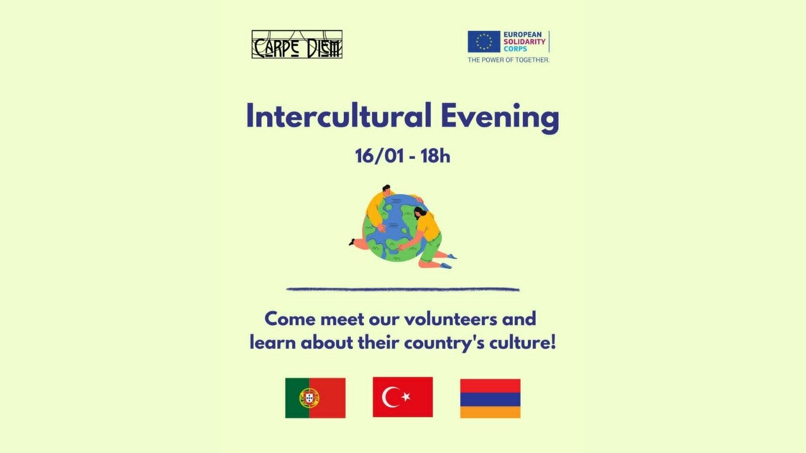 Svoje zemlje, običaje i kulturu publici će približiti strani volonteri udruge Carpe Diem – Vanda, Harut i Ayberk, koji u Karlovcu borave u sklopu programa Europske snage solidarnosti. Posjetitelje očekuju kratke prezentacije o navedenim državama, ali i prilika za kušanje tradicionalnih jela i slastica karakterističnih za njihove kulture.