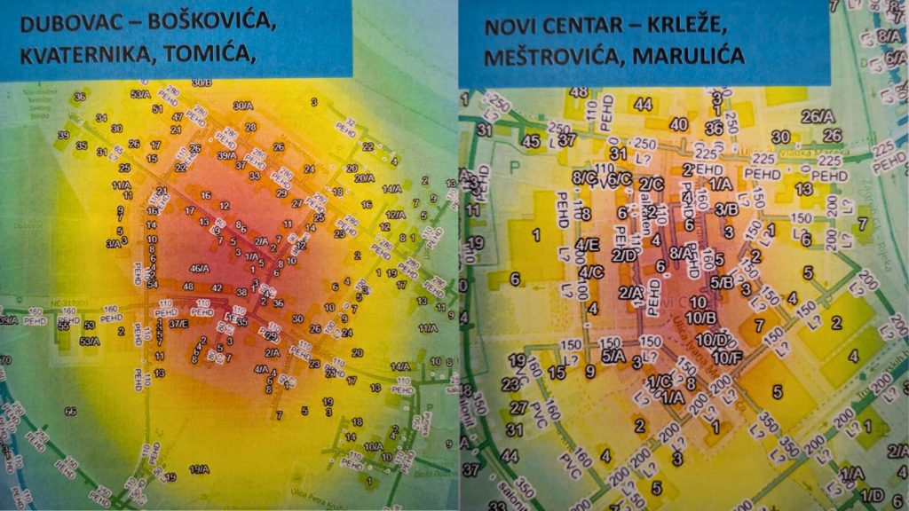 Tijekom četveromjesečnog terenskog rada provedena su opsežna mjerenja tlakova, protoka i mutnoće vode, kao i laboratorijske analize. Paralelno su vođeni razgovori s korisnicima o učestalosti i okolnostima pojave zamućenja, smanjenog tlaka, promjena boje vode i pojave taloga. Sve prijave i zapažanja objedinjene su u jedinstven sustav podataka. Na temelju prikupljenih informacija izrađena je tzv. „heat map“ karta koja prikazuje žarišta pojave zamućenja po pojedinim zonama grada.