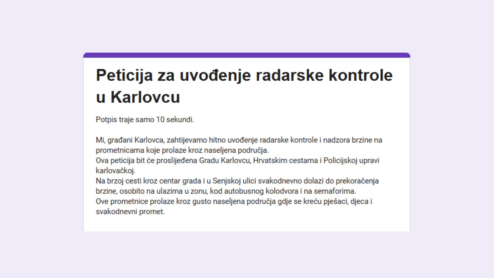 Građanska inicijativa Grada Karlovca pokrenula je peticiju za uvođenje radarske kontrole i nadzora brzine na prometnicama koje prolaze kroz naseljena područja. Inicijativa je odgovor na česta prekoračenja brzine, osobito na brzoj cesti kroz centar grada i u Senjskoj ulici, što predstavlja ozbiljan rizik za pješake i sve sudionike u prometu.