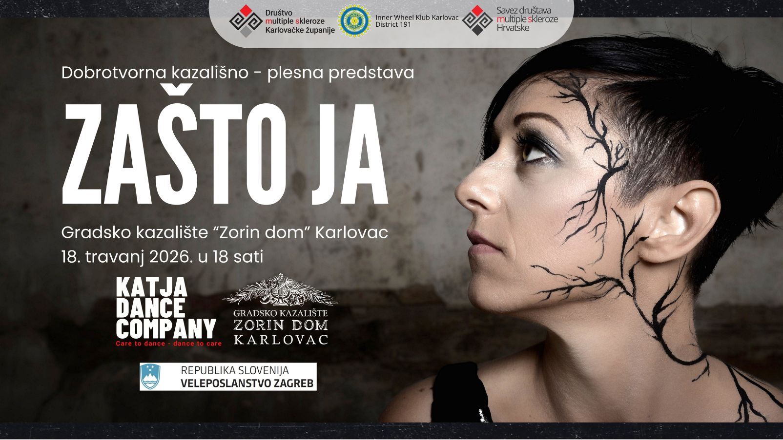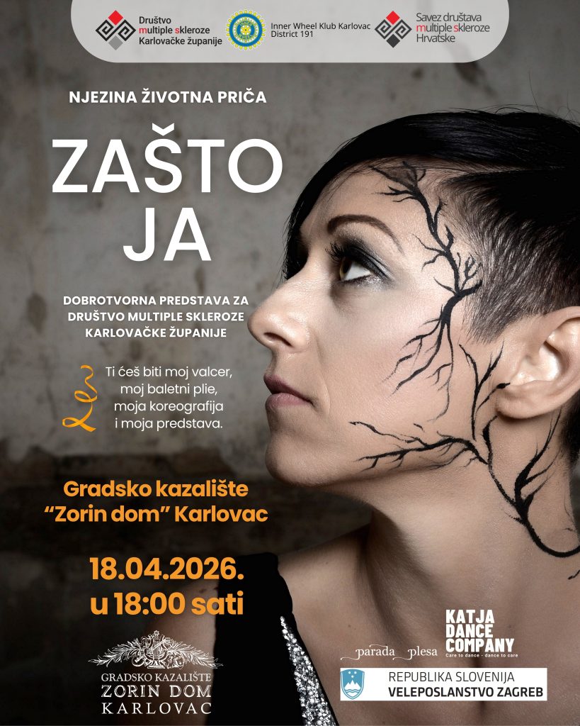 U Gradskom kazalištu „Zorin dom“ u Karlovcu održat će se dobrotvorna kazališno-plesna multimedijska predstava „Zašto ja“, koja donosi snažnu i dirljivu priču o životu žene s multiplom sklerozom. Kroz spoj pokreta, glazbe i riječi publika će imati priliku upoznati svakodnevicu Tadeje Polanšček – majke, supruge i prijateljice koja se unatoč bolesti bori za dostojanstven i ispunjen život.