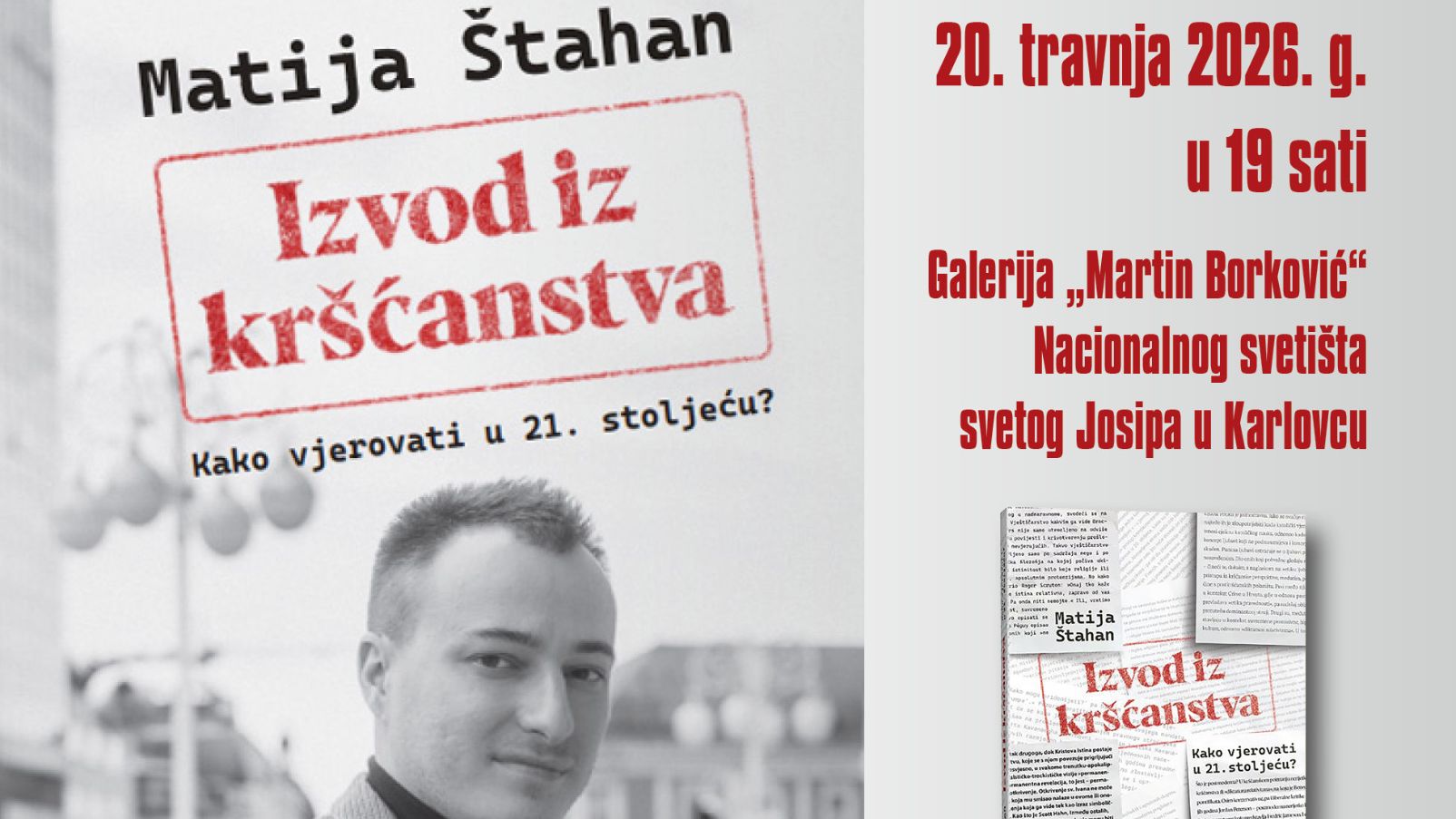 Udruga Biskup Martin Borković i Nacionalno svetište svetog Josipa u Karlovcu pozivaju građane na predstavljanje knjige „Izvod iz kršćanstva – Kako vjerovati u 21. stoljeću?” autora Matije Štahana, hrvatskog katoličkog laika i istaknutog intelektualca.